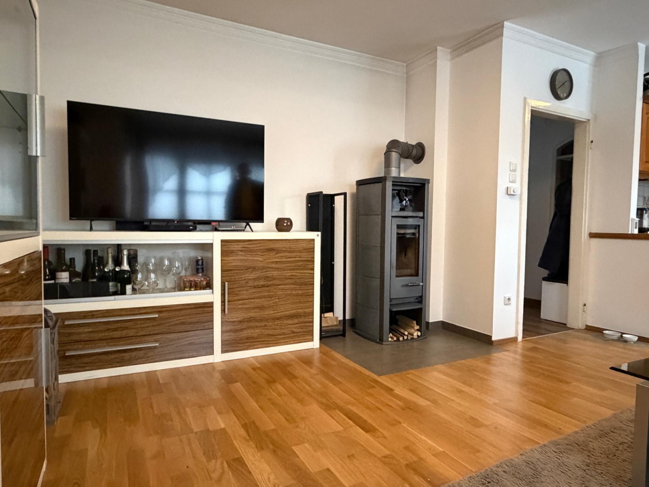 Das Erdgeschoß verfügt über eine gemütliche Wohn-Essküche mit einer zeitlos möblierten Küche und Holzofen, ein kleines Vorzimmer und ein exklusives Badezimmer mit großer Badewanne, Doppelwaschtisch und WC.